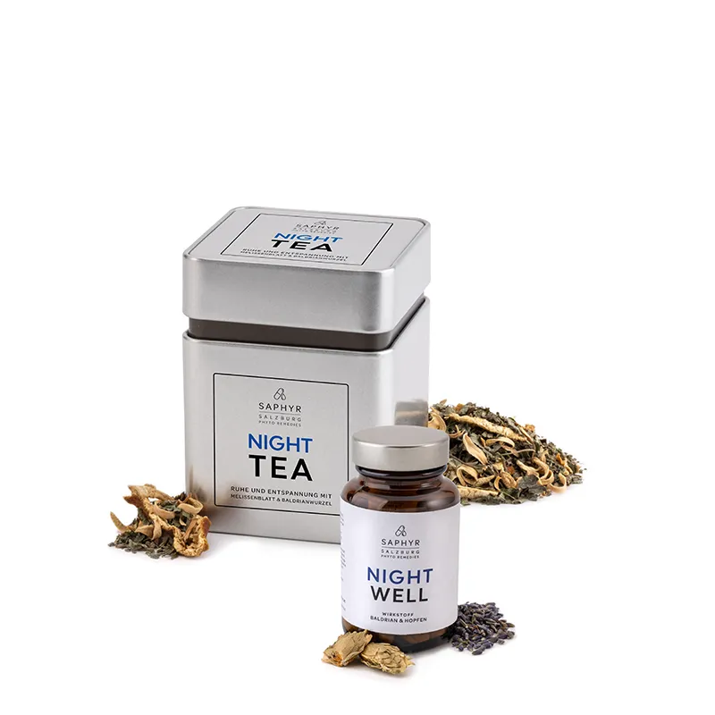 Das Premium Paket Gute Nacht von Saphyr ist speziell entwickelt, um Ihnen zu einem entspannten Abend und tiefem, erholsamem Schlaf zu verhelfen. Mit wertvollen Pflanzenextrakten und beruhigenden Tees unterstützt das Set Ihre natürliche Schlafregulation und fördert Ruhe und Wohlbefinden.